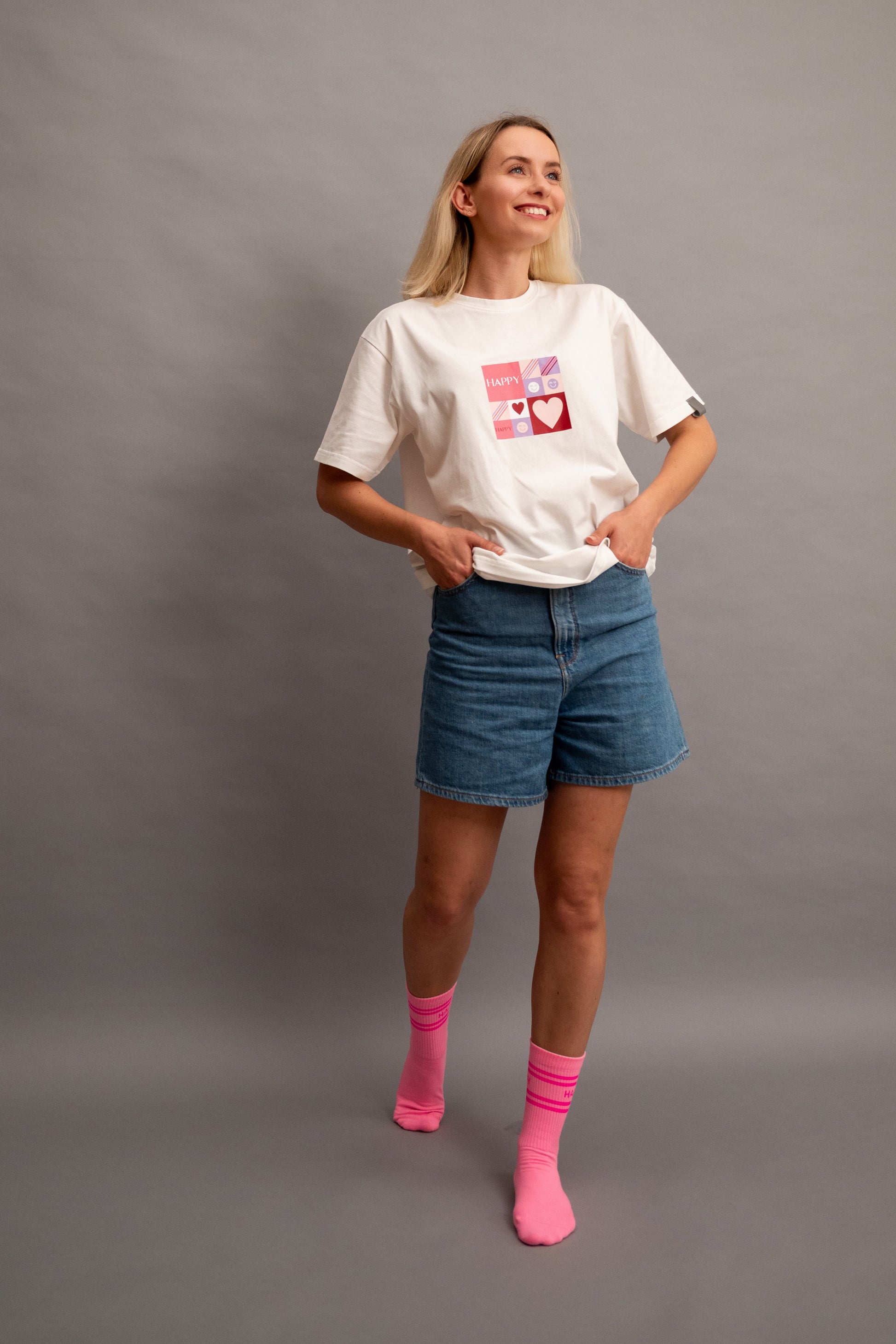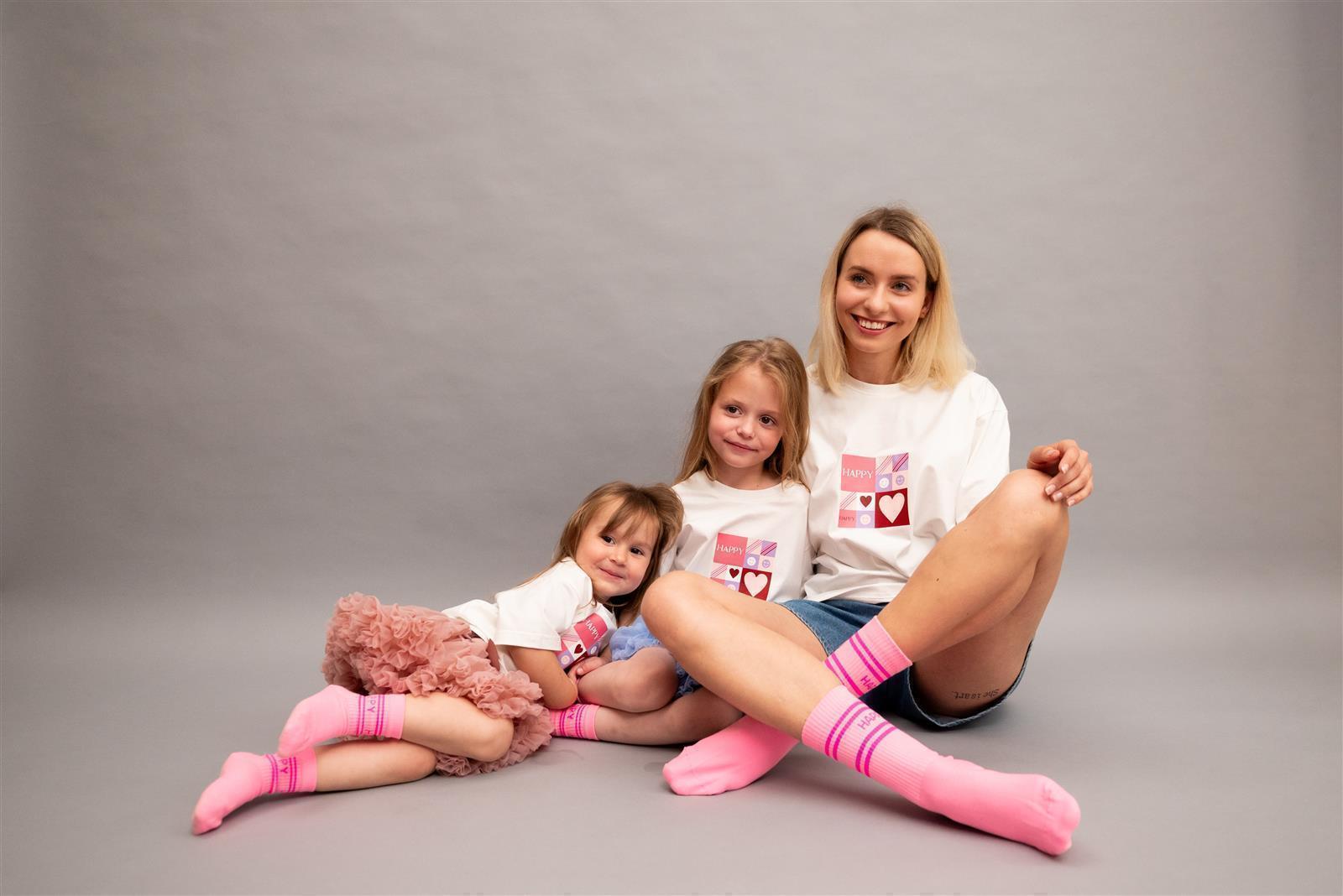 Entdecke unser fröhliches T-Shirt-Set für Mama und Tochter! Mit dem HAPPY-Schriftzug auf der Vorderseite und einem kleinen, aufgenähten Smiley auf der Rückseite zaubern diese Shirts ein Lächeln auf jedes Gesicht. Aus 100% Baumwolle gefertigt, sind sie super bequem. Ergänze das Outfit mit den passenden Socken für einen rundum glücklichen und gemütlichen Look!