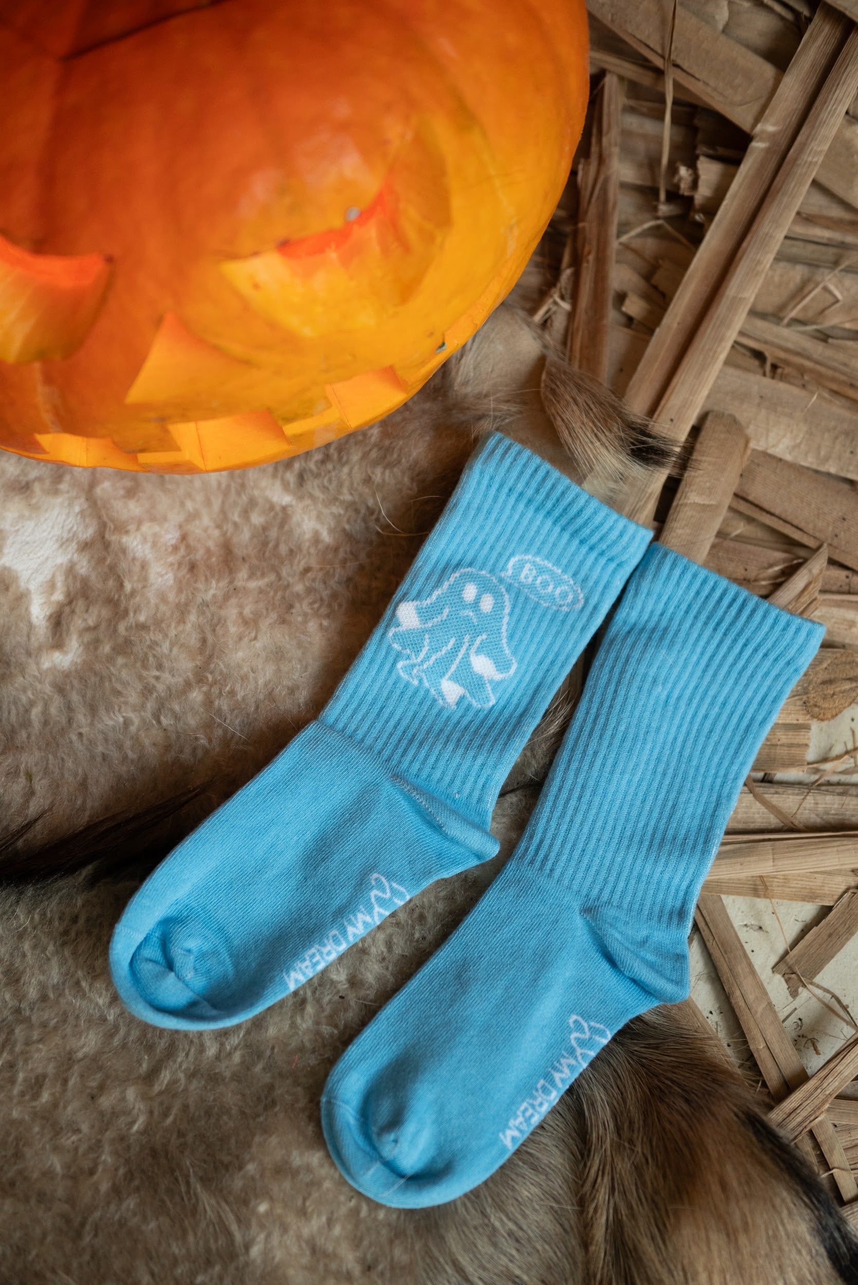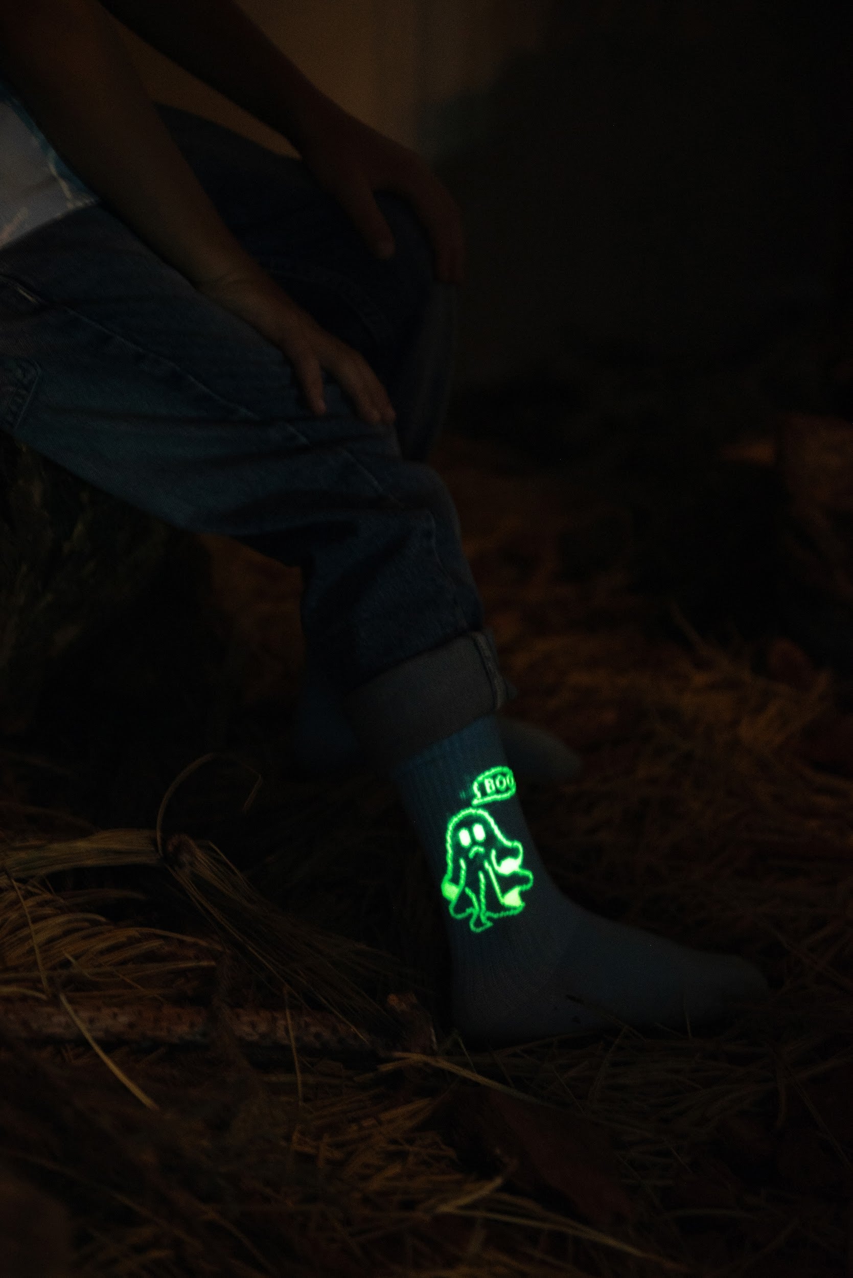 Socken-Kollektion mit drei leuchtenden Designs: der fröhliche Geist „Boo“, ein gruseliger Kürbis und schaurige Spinnen. Diese Socken sind nicht nur für Halloween, sondern auch für den Alltag ein echter Hingucker! Der Glow-in-the-Dark-Effekt macht sie besonders spannend – Kinder lieben es, ihre Socken mit einer Taschenlampe aufzuladen und den magischen Glanz zu sehen.