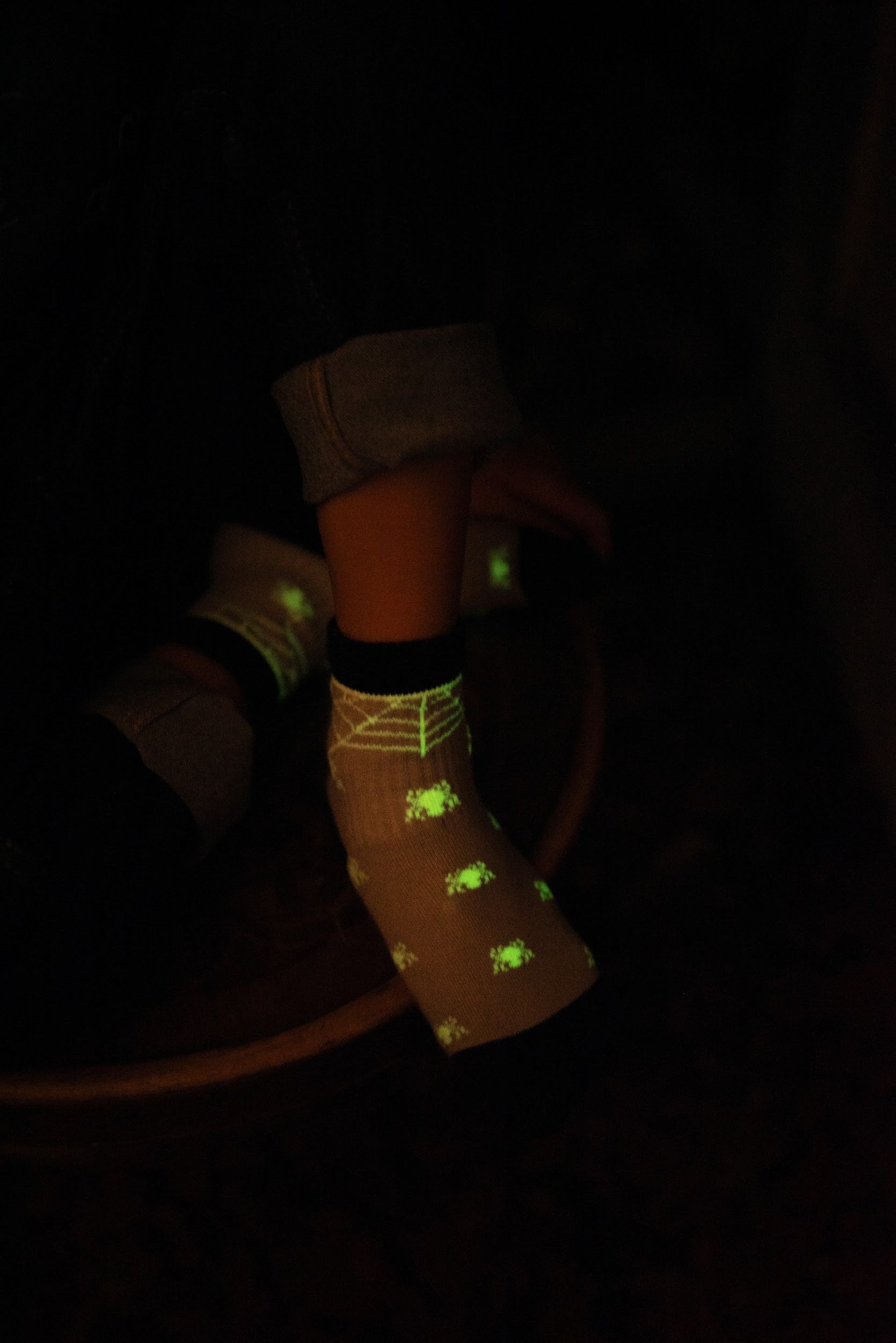 Socken-Kollektion mit drei leuchtenden Designs: der fröhliche Geist „Boo“, ein gruseliger Kürbis und schaurige Spinnen. Diese Socken sind nicht nur für Halloween, sondern auch für den Alltag ein echter Hingucker! Der Glow-in-the-Dark-Effekt macht sie besonders spannend – Kinder lieben es, ihre Socken mit einer Taschenlampe aufzuladen und den magischen Glanz zu sehen.
